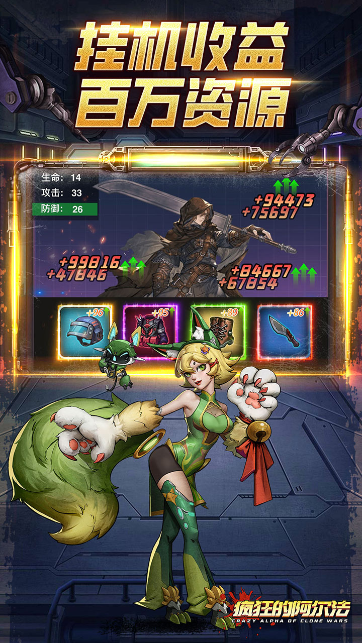 《疯狂的阿尔法》是一款以末日废土+科幻克隆为主题的放置卡牌游戏。游戏采用新奇暗黑风格,将荒芜的废土世界与失控的克隆科技完美融合,带来极具冲击力的视觉体验。在这里,玩家将扮演一名末世冒险家,收集并培养来自不同时代的传奇克隆战士,组建最强克隆军团!
