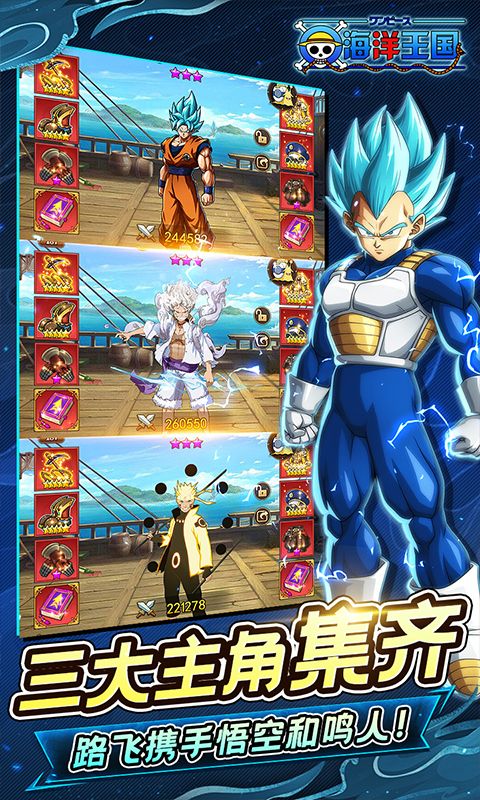 《海洋王国》0.1折IP联动免费版,每天送3000元平台代金券!梦幻联动经典突破!民工漫IP大集结,海贼与龙珠火影联动,更有充值永久0.1折!路飞携手悟空和鸣人,一起寻找伙伴共闯新世界。好激动哦,下个联动人物是谁呢?