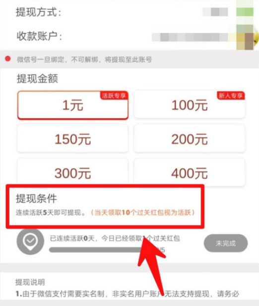 5.选择提现金额,即可进行提现(1元提现需要连续登陆5天软件才可以提现)