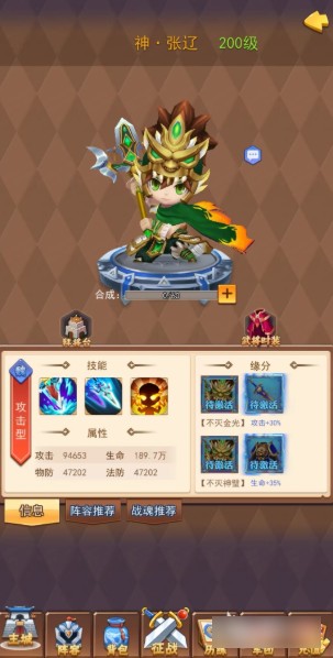 其中魏国的神张辽是小编认为目前神武将中最出色的一个,主动技能伤害对方前排,并且有极高几率添加冷冻效果,可以附加控制状态。主动技能无双突刺对单个敌人造成海量输出,并且在使用之后如果击杀了目标则再追加一次技能。如果伤害到被冷冻的敌人则有额外加成,使用之后还将为我方全体施加鼓舞效果,提高攻击和防御,非常全面的武将。有群伤有单体伤害,还有大量属性加成和附加效果,完全能够成为队伍中最核心的角色,拥有极高培养价值。