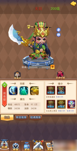 在前期阶段和绝大多数玩家来说,在阵容组成方面同一阵营的武将能够带来巨大的属性加成,但是在后期,武将的选择就盖过加成所带来的收益,尤其是顶级武将更是能以一当百。所以在后期可以打破阵营的限制进行混搭组合,小编推荐给大家的是魏国的神张辽,恶来典韦和虎痴许褚,蜀国的刘备、关羽、张飞。这样既保证了拥有绝大部分阵容收益,又能将两大阵营中最优秀的武将选择了出来。