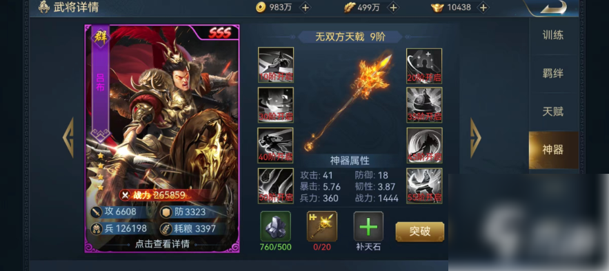 在被动技能身先士卒的影响下,进入战斗时吕布的移动速度大幅提升,并且进行第一次攻击时还将附加额外的范围眩晕效果。在被动技能辕门射戟的影响下攻击时有一定几率对身前的其他敌方武将造成伤害,并且附加眩晕。最后天下无双的效果是进入战斗后就提升自身武力值,一直持续到战斗结束。从这些被动技能效果也可以看出,吕布在整场都有很好的输出能力,属于非常稳定的类型。看一下特殊天赋和突破效果,吕布拥有6个不同的天赋,可以提升伤害效果,获得复活机会,提升触发被动技能的几率以及提高初始战意,这些效果整体来看非常实用。