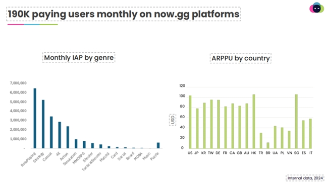 作为全球最大的游戏分发平台,地位仅次于Google Play 和Apple Store。 Now.gg上每个月约有19W名付费用户。角色扮演、策略、休闲等多类型应用内购买收入均达百万美元。相较于同行,Now.gg最大的优势便在于技术力较强,不仅有一站式集成的便捷分发操作,其云端功能更是能令玩家仅靠一条嵌入式URL,便可无需下载,先行云端体验游戏,在实践与传播中都收获了相当不俗的效果。