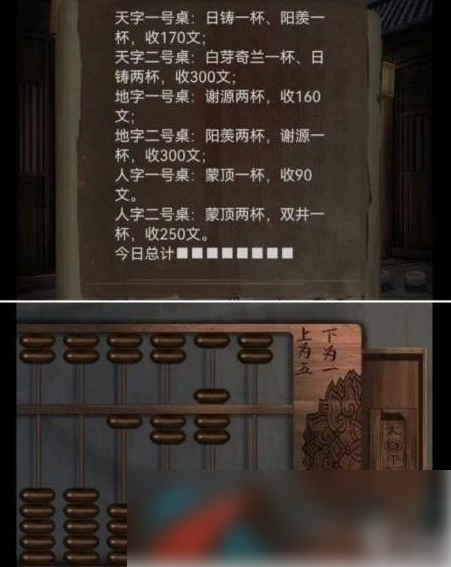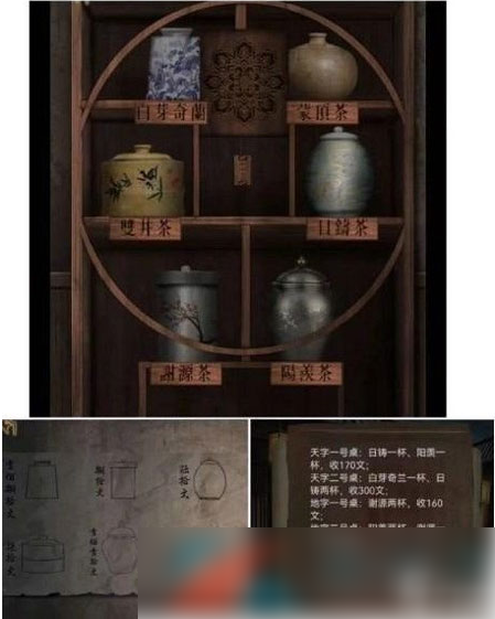 4、根据墙上信息移动茶罐获得叶子戏牌,按照总计拨动算盘获得戏牌;
