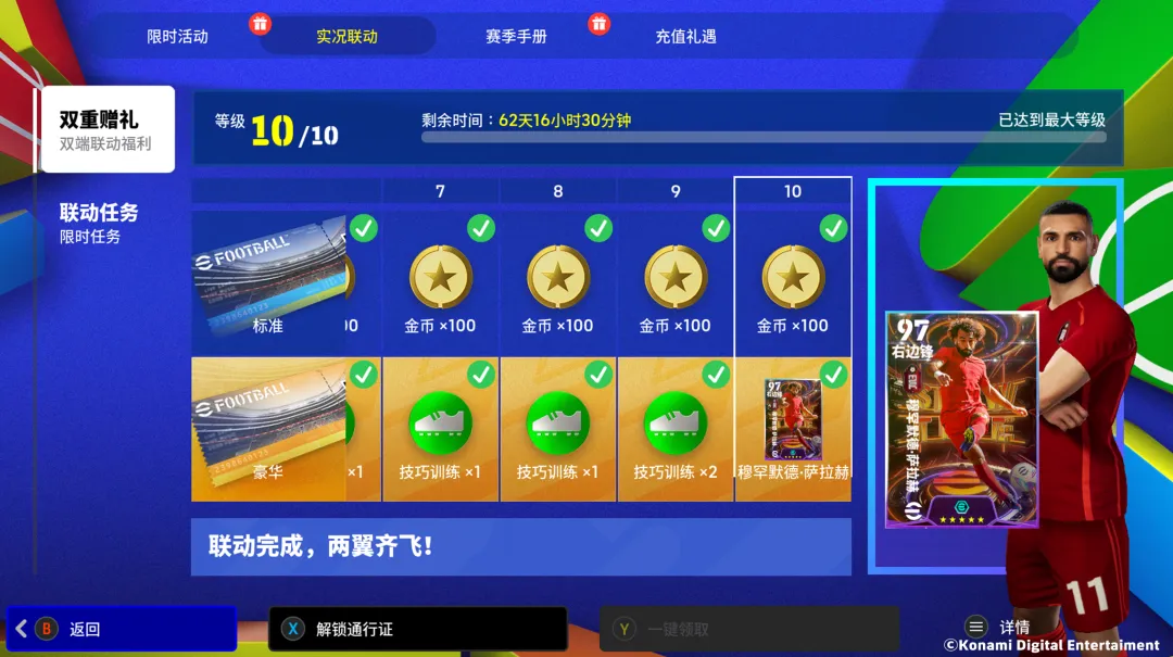 实况足球双端联动通行证任务重磅开启!使用手游账号登陆端游并完成通行证任务,获得经验值后可领取通行证等级奖励。免费版通行证双端满级后可获得【1000金币】;花费点卡解锁豪华版通行证,双端满级后可额外获得【技巧训练】*10和【增能梦幻精选萨拉赫】。