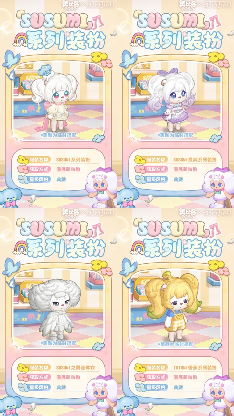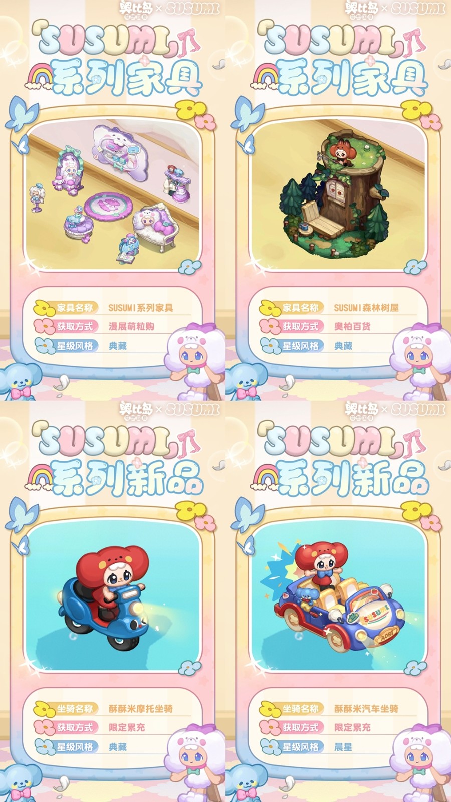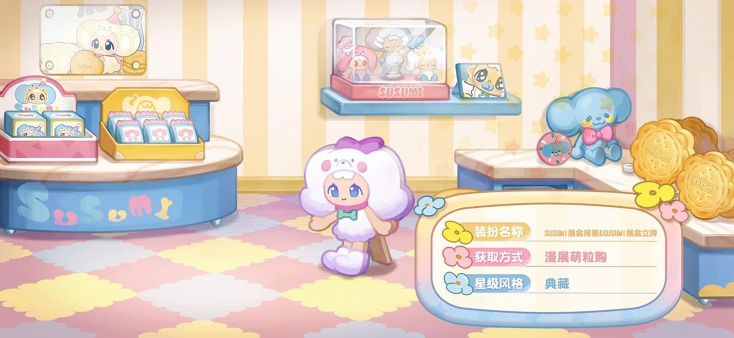 参与「漫展萌粒购」限时活动可获得活动限定奖励,奖励包括「SUSUMI瓷器裙」「SUSUMI贵宾绒裙」等限定装扮,还有「SUSUMI衣帽柜」「SUSUMI玩偶沙发」等限定家具散件,全新的头像框「快乐酥酥米」、背景卡「SUSUMI展会背景」,双人座椅「SUSUMI宝贝软垫」、动作「爱心亲签」及晨星品质称号等超多惊喜礼物!
