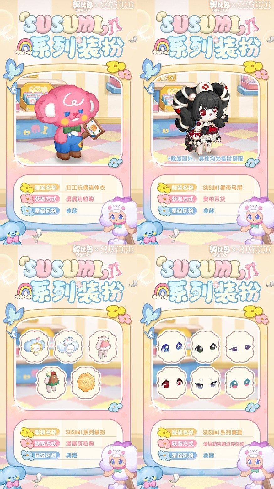 同时,在本次活动中达到累计抽取次数,即可打开「SUSUMI眼妆宝箱」随机获得一款SUSUMI眼妆,宝箱内奖励不会重复获得。完成全部物品收集的小奥比,还可获得限定装扮「SUSUMI打工玩偶」。