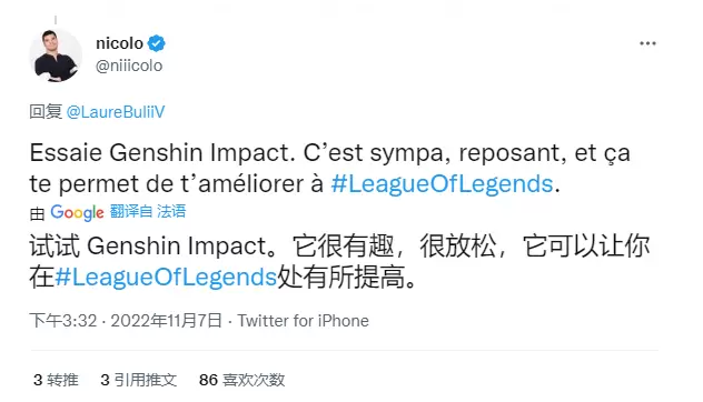 电竞赛事记者Laure Valée发文表示在下赛季开赛前不知道能够做些什么,而Nicolo Laurent在推特上回复表示可以试试玩原神,称《原神》是个很有趣的游戏,还开玩笑的表示玩《原神》可以帮助玩家提高《英雄联盟》水平。