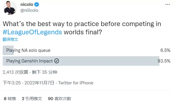拳头CEO在说完这条帖子的内容后,又发了一个投票问:“进世界赛决赛之前大家最好的练习方式是什么?”93.5%的人投票给了玩原神