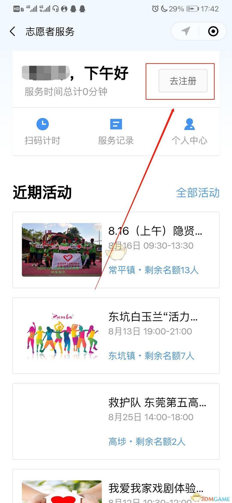 3、进入志愿者服务页面后,点击“注册”进行志愿者注册;