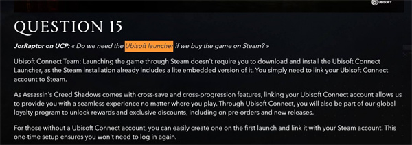 此外,根据育碧今年2月发布的《刺客信条:影》最新FAQ,在第15个问题中,育碧最新确认《刺客信条:影》PC Steam版并不需要下载和安装育碧自家的Connect启动器。