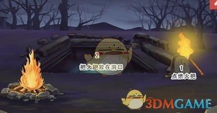 1、开始先点击右边的木柜,把它拖到左边火中,点燃火把后,再把火把拖到洞口这里。
