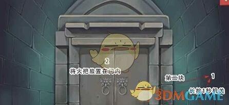 2、然后进入洞中,长按右侧的机关,门打开后把火把放到门内。