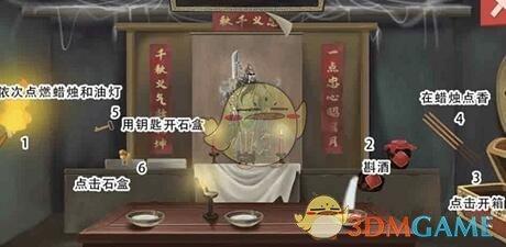 3、进去之后点燃蜡烛和油灯,然后拖动右边的酒缸把桌上的三个空碗倒满,再点击右侧的宝箱,拖到蜡烛上点燃,钥匙对石盒使用。