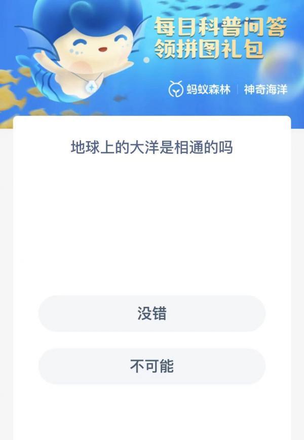 2022支付宝蚂蚁海洋11月7日的题目已经更新了,今天的题目为:地球上的大洋是相通的吗?没错还是不可能呢?可能很多小伙伴可能还不太清楚正确答案是什么。下面小编就为大家带来了正确答案分享,希望能帮助到你。