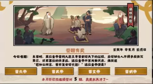 无悔华夏11.5渔樵问答问题来了,东晋时,某位皇帝曾问大臣王导晋朝得天下的过程,当得知先人不择手段诛灭异己,弑君篡位的往事后,这位皇帝不禁掩面付床,痛哭道”若如宫所言,晋祚复安得长远“,这位皇帝便是?很多小伙伴还不清楚正确答案,那么接下来和小编一起来了解一下11.5渔礁问答的答案是什么吧。