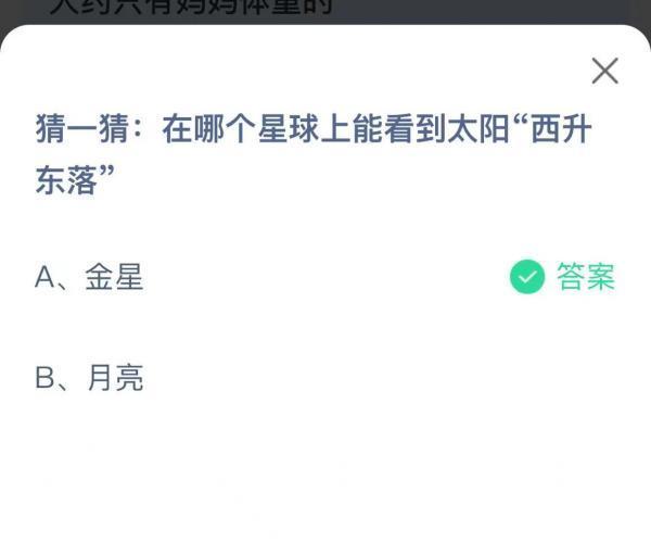 2022支付宝蚂蚁庄园11月5日的题目已经更新了,今天的题目为:在哪个星球上能看到太阳西升东落?金星还是月亮呢?正确答案是什么,可能很多小伙伴可能还不太清楚。下面小编就为大家带来了正确答案分享,希望能帮助到你。