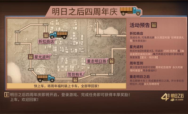 周年庆福利第四弹:重走明日之路!还记得当初进入明日世界时的卡车吗?还记得那个说着“往这边来”的他吗?完成重走明日之路,并分享纪念明信片,即可获得永久珍稀称号!