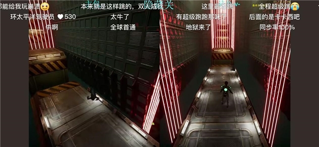 3月18日凌晨,主播「E1uM4y」与「sharkOvO」在3个小时的直播磨合后,开始了对关卡的冲锋!和大多数发起挑战的主播一样,在第三关高频推进的激光模式下前进,「E1uM4y」与「sharkOvO」失败了一次又一次,但不难发现他们的操作愈发变得熟练,动作之间的同步率也越来越高。没有一名在场的观众能想到,今晚他们将见证首通的诞生,“左右横移接滑铲前跃”连续突破激光矩阵,紧接着第四关,第五关,一鼓作气拿下了隐藏关卡的世界首通。弹幕刷屏惊呼:“这同步率能开环太平洋机甲了!”