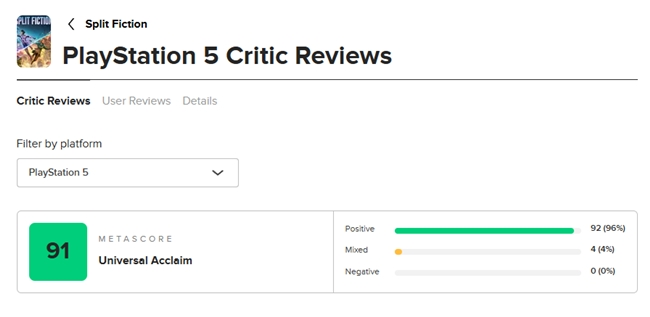 除了对玩家的尊重之外,对自己作品的精心打磨更是让《双影奇境》成为了2025开年以来评分最高的游戏。Metacritic上PS5版共获得84家媒体的评分,平均分高达91分。PC games、Eurogamer、Gamereactor UK等9家媒体都给予本作满分评价,其中Eurogamer认为,《双影奇境》从头到尾都十分精彩,是迄今为止最具创造性和乐趣的合作游戏之一,游戏内融合了大量的游戏彩蛋,让许多Z世代玩家倍感亲切。